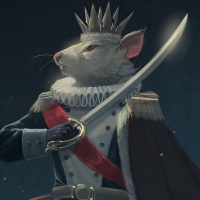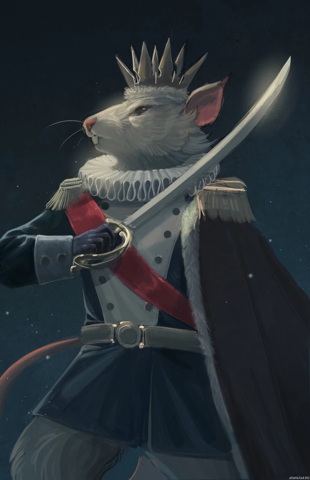 upright posture and human-like attire. It is adorned with a crown atop its head, signifying royalty or nobility. In its right paw, the rat holds a sword, suggesting military or warrior status. The overall color palette is dark, conveying