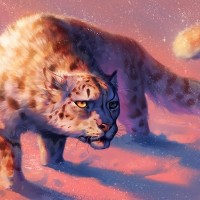 a mountainous region given the steep terrain and the snow covering the ground. The artwork has a vibrant color palette with