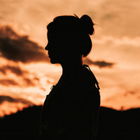 The image shows a silhouette of a woman standing at sunset. She has her back turned to the viewer, and her hair is in a bun. Her figure is dark against the bright sky. There are clouds in the sky, indicating that it could be early evening or late afternoon.