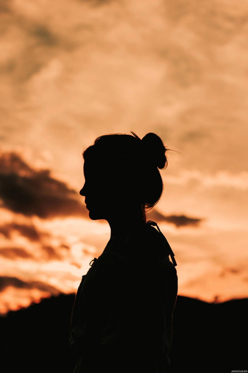 На картинке изображен силуэт женщины, стоящей на закате. Она повернулась спиной к зрителю, и ее волосы в булке. Ее фигура темна на фоне яркого неба. В небе есть облака, указывающие на то, что это может быть ранним вечером или поздним днем.