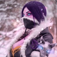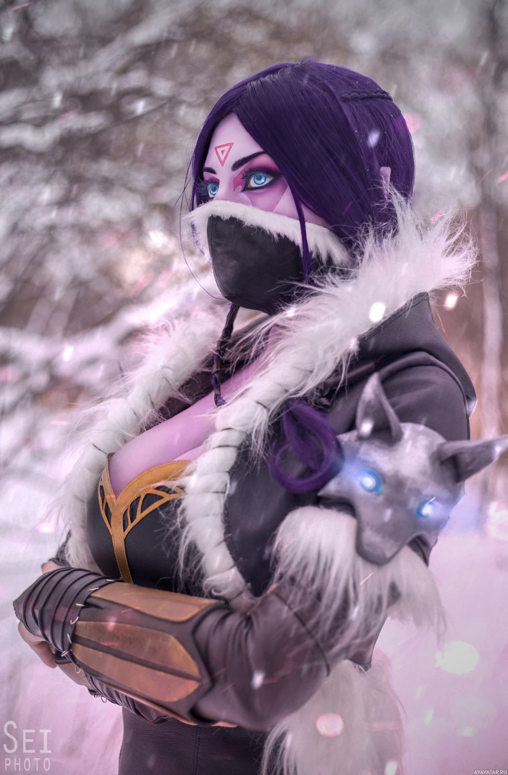 a character from the game "Dota 2," known as Templar Assassin. The character is depicted wearing what appears to be a winter jacket, gloves, and a mask with