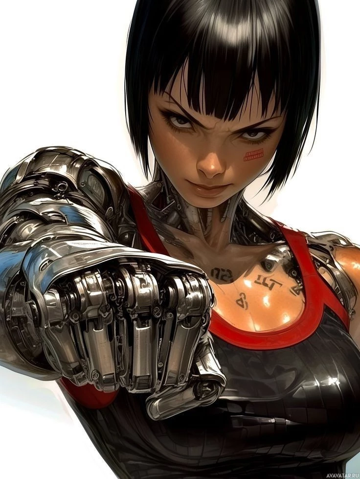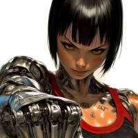 the mechanical parts of her design. There are visible robotic arms attached to her shoulders, which contribute to her robotic appearance. The overall style of the image aligns with the science fiction genre, often associated with futuristic technology and themes.