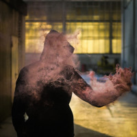 The image shows a person standing in what appears to be an industrial or warehouse setting. They are wearing a hooded top, and there is smoke or some type of vapor emanating from them, which creates