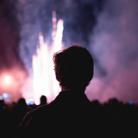 На картинке изображен силуэт человека, скорее всего мужчины, спиной к зрителю. Они, кажется, смотрят на что-то из кадра. За ними происходит событие, когда фейерверки отправляются в ночное небо, создавая впечатляющее отображение огней и цветов, которые освещают сцену. Толпа, кажется, занимается просмотром спектакля, добавляя к изображению живую атмосферу.
