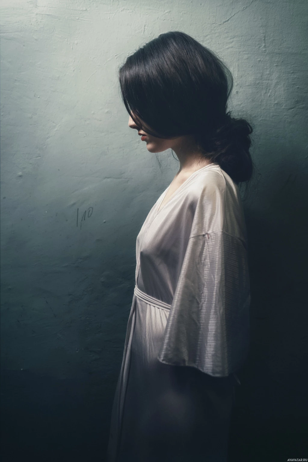 The image shows a woman standing with her back to the viewer. She appears to be looking down and away from the camera, giving an impression of introspection or