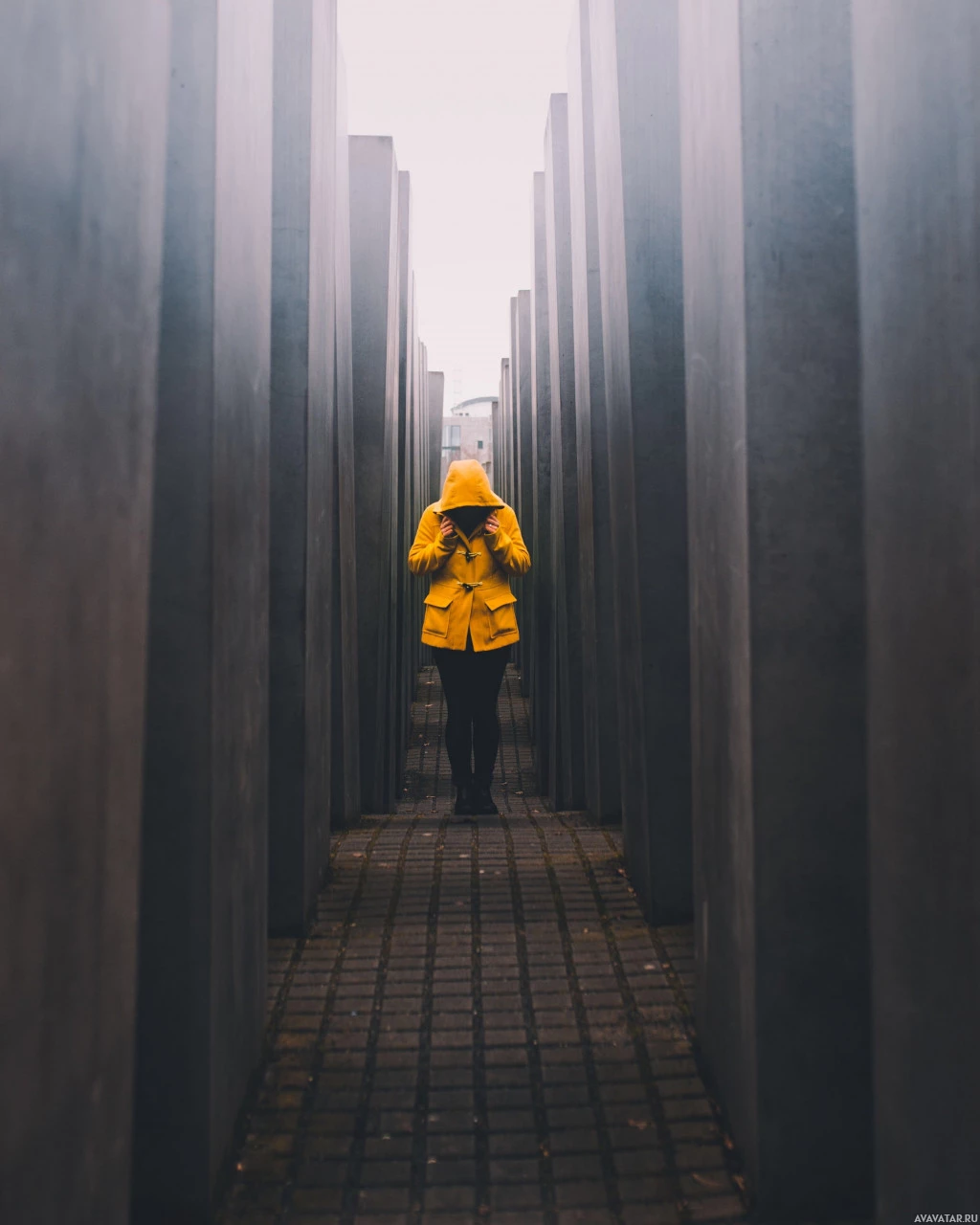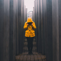 endless field, which are meant to evoke the loss of Jewish lives during the Holocaust. The person is dressed in cold-weather attire, including a yellow raincoat and