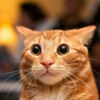 tabby cat with a wide-eyed expression that might suggest surprise or shock. The background is blurred but appears to be