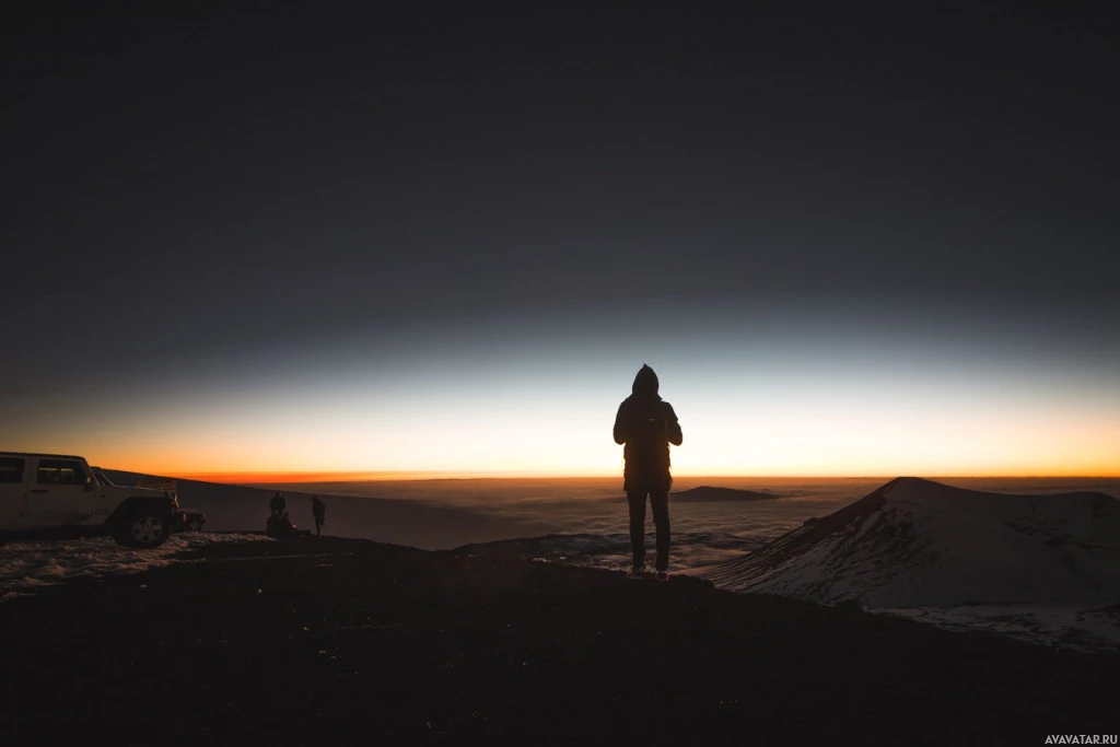 a silhouette of a person standing on a mountainous terrain at either sunrise or sunset. The sky has a gradient from orange to dark blue, suggesting
