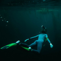 The image shows a person scuba diving underwater. The diver is wearing a full body wetsuit, and the equipment includes flippers and