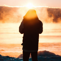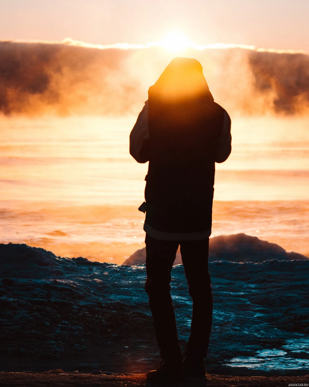 На картинке изображен силуэт человека, стоящего на каменистой береговой линии во время заката. Человек носит куртку с капюшоном и лицом к морю, с солнцем, видимым прямо за ними, создавая атмосферный эффект с лучами света. Фон предполагает безмятежный пейзаж с сочетанием сухопутных и водных особенностей, возможно, указывающих на прибрежную зону в течение золотого часа.