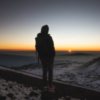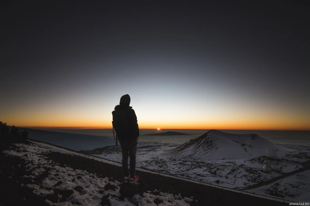 rugged terrain with patches of snow on the ground. In the background, there are mountains and what looks like a volcano with a prominent summit. The overall setting conveys a sense of solitude and tranquility as the person seems to be alone in this vast