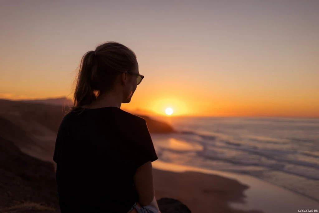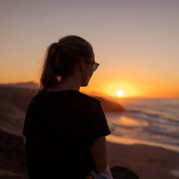 the warm hues in the sky. The individual is looking towards the horizon where the sun is setting or rising. They are wearing sunglasses and have their back to the camera, providing a view from behind. It's