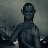 dark clouds overhead, adding to the overall somber atmosphere. The art style and elements suggest a horror or dark fantasy theme rather than a typical mermaid depiction found in lighter