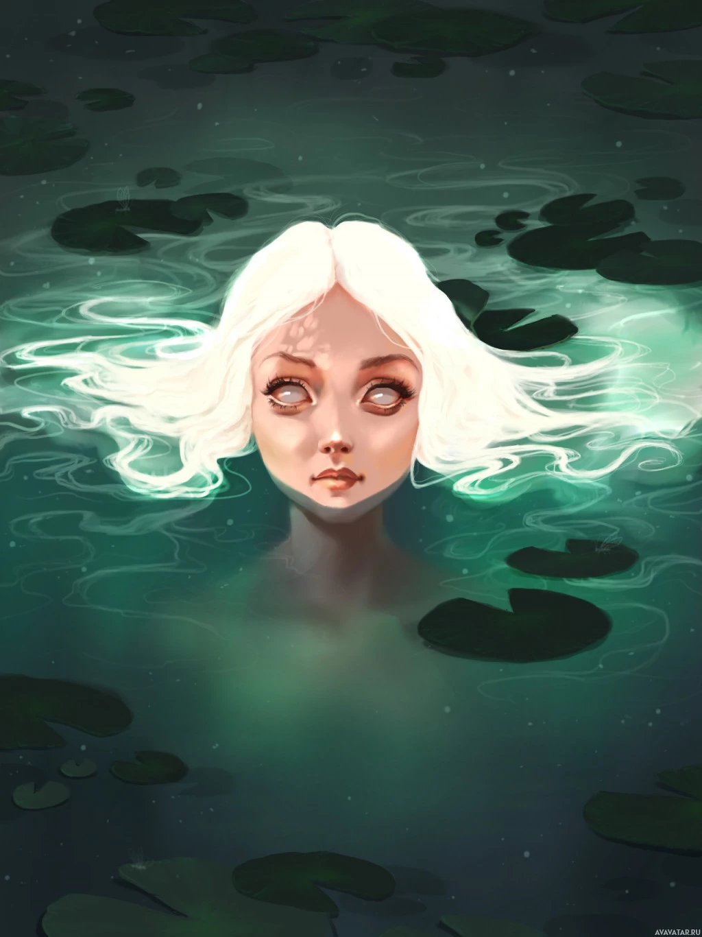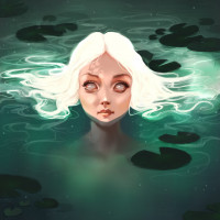 a serene expression on her face and is surrounded by what appears to be lily pads floating on the surface of the water. The overall atmosphere suggests a fantasy or magical theme, possibly inspired by