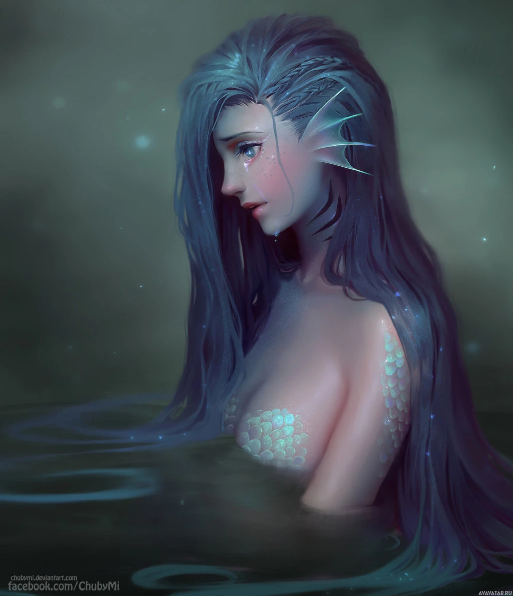 blue hair and a tail, which are typical features for mermaids in folklore and fantasy artwork. The mermaid appears to be sitting or standing in