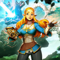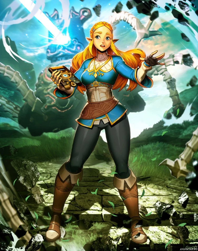 a female character from the video game "The Legend of Zelda: Breath of the Wild." She is depicted standing on
