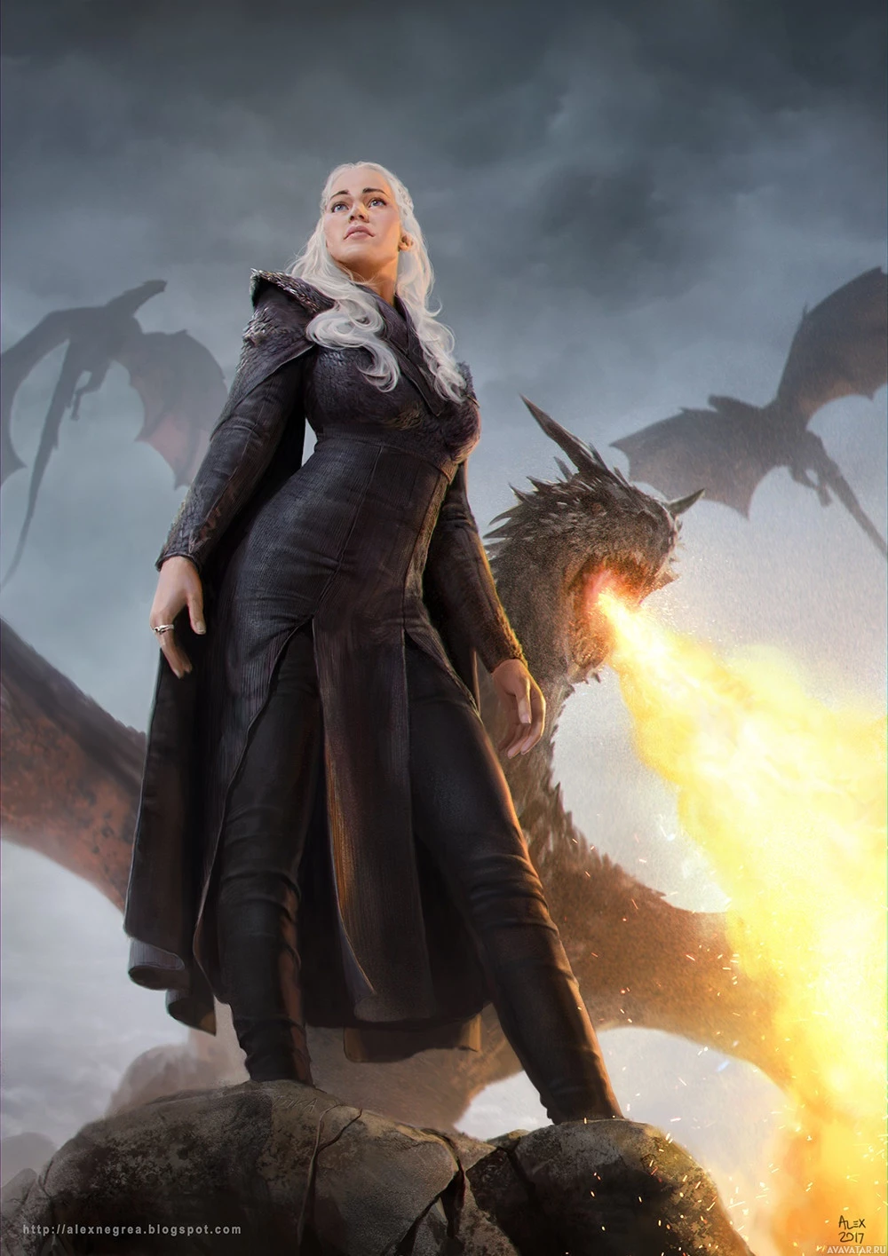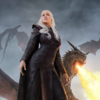 Daenerys Targaryen, portrayed by actress Emilia Clarke. She is standing confidently in front of three dragons with flames coming from their mouths, suggesting her connection to and control over