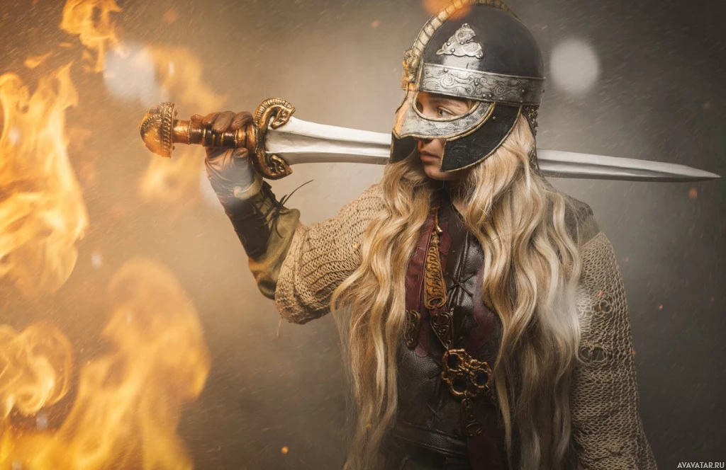 The image depicts a person dressed as a warrior or character from Middle-earth, holding a sword and standing in front of flames. The individual appears to be cosplaying as one might do at conventions that celebrate