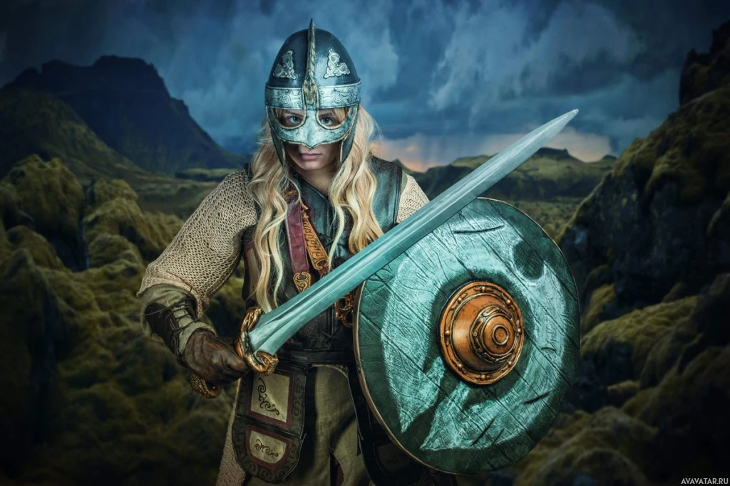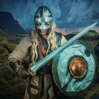 The image shows a person dressed as a character from Middle-earth, holding a sword. This individual appears to be cosplaying the role, wearing armor and carrying items that resemble those depicted in the Lord of the Rings stories. The setting looks like it could be