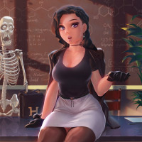 На картинке изображен анимированный женский персонаж, сидящий за столом. У нее темные волосы, она носит черный наряд с галстуком и очками и держит в руке то, что кажется смартфоном или планшетом. Рядом с ней на столе стоит модель скелета. Обстановка предполагает, что это может быть классная комната или лабораторная среда. Есть также другие предметы, такие как книги и часы на заднем плане.