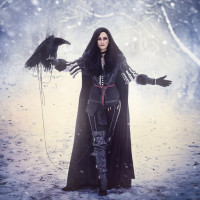 fantasy environment. In her hands, she holds two items: what appears to be a crow (possibly a magical item or creature) perched on one hand, and
