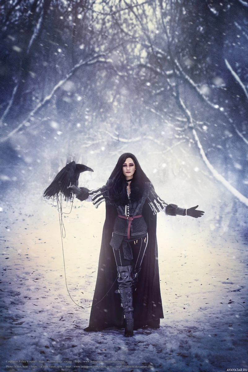 a snowy path with trees covered in snow around her. Yennefer is wearing a long black coat, dark pants, and boots that are typical of the game's