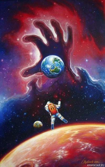 The image shows a surreal and artistic depiction of an astronaut floating in space. Below the astronaut, there appears to be a hand reaching out towards a planet that resembles Earth. The background is vivid with swirling colors, giving it an almost psychedelic or cosmic appearance. There are also elements suggesting other planets and stars, creating