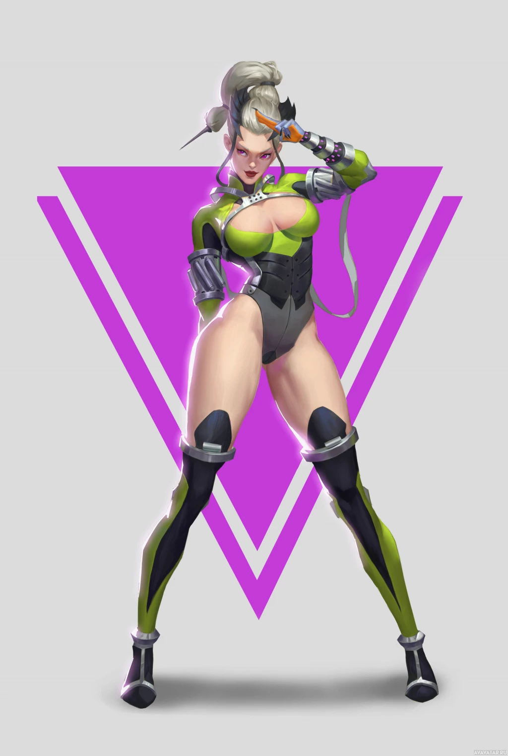 white hair and is posing confidently, with her hand on her hip. In the background, there's a purple graphic element resembling a logo or emblem, which adds to the overall theme of the image, possibly suggesting she could be from