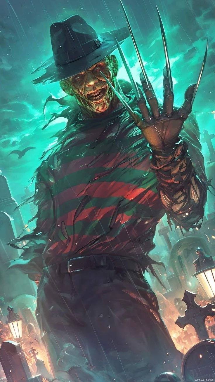 an urban environment that could be a city street at night, enhancing the sense of danger and threat commonly associated with Freddy Krueger's presence in films and stories.