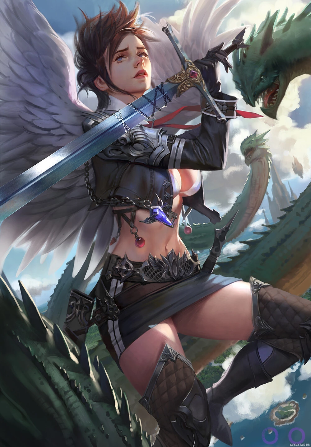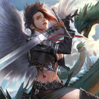 a female warrior or adventurer, equipped with a sword and wearing armor that includes wings on her back, giving her an angelic appearance. She is standing amidst what looks like