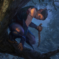 a tree branch, hugging the bark tightly with their hands, looking upwards towards something or someone that is not visible in the frame. The elf has pointed ears and what appears to be a pair of large,