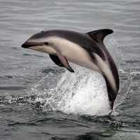 The image shows a small dolphin leaping out of the water. It is an action shot capturing the moment when the dolphin has just taken flight, possibly in pursuit of its next splash or to catch some air above the surface of the water.