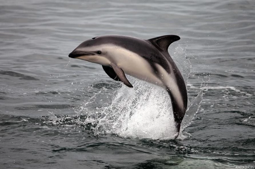 На снимке изображен маленький дельфин, выпрыгивающий из воды. В этой запечатленной экшен сцене дельфин только что совершил полет, возможно, в погоне за своим следующим всплеском или чтобы поймать немного воздуха над поверхностью воды.