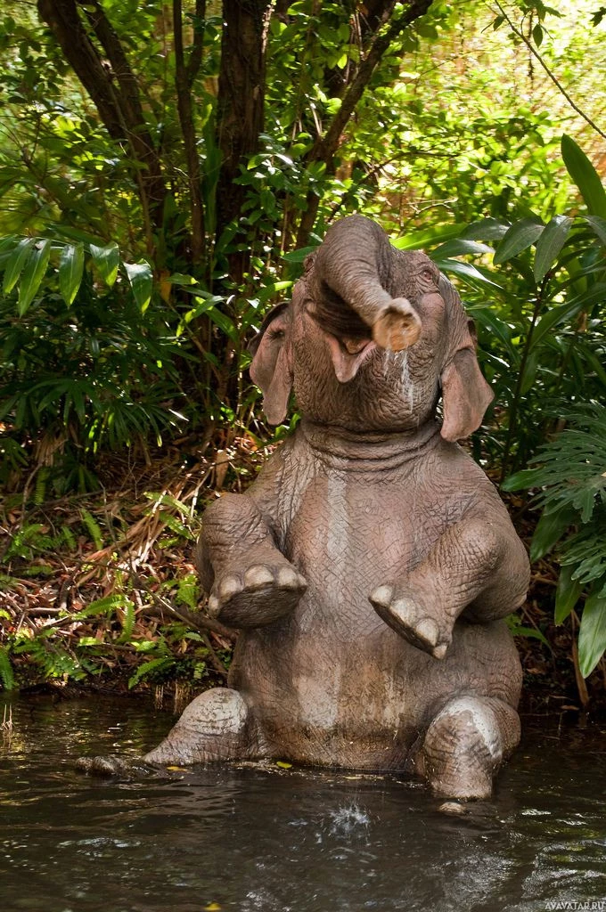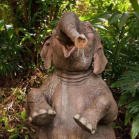 an elephant statue that appears to be designed in a whimsical and anthropomorphic style. It's depicted with human-like arms and legs, and it seems to be sitting or squatting down in water, perhaps mimicking