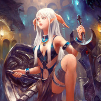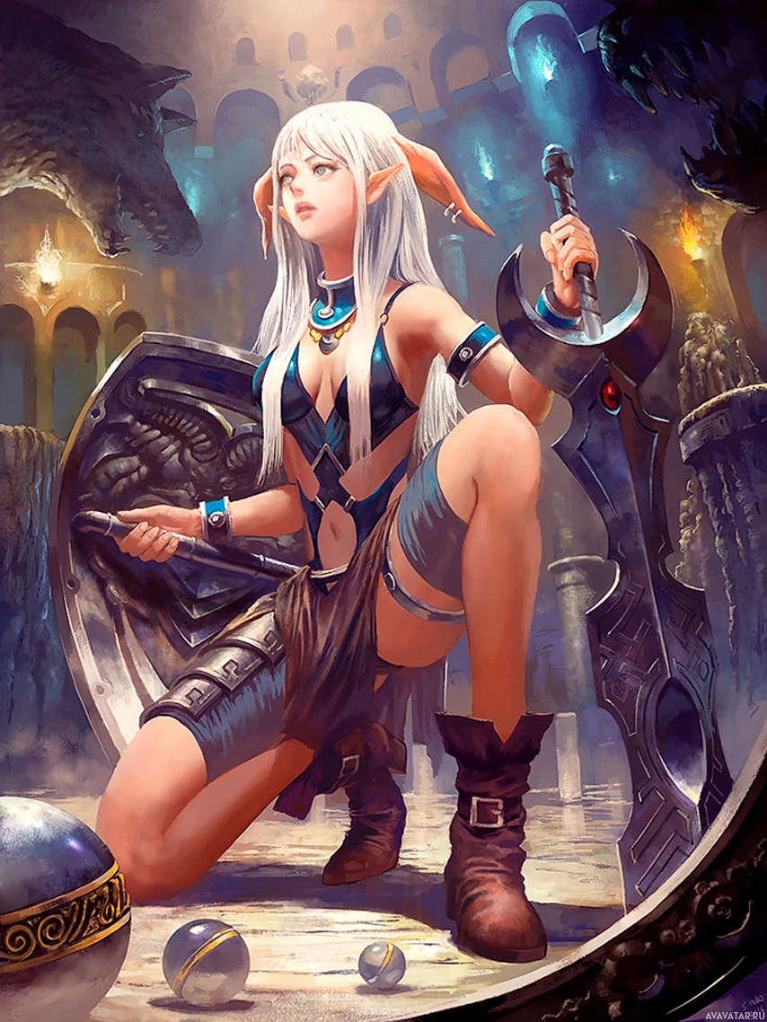 intricate designs on the chest piece, suggesting she might be a warrior or guardian type of elf. The setting includes a stone bridge and some sort of magical-looking ball in front of her feet, which adds to