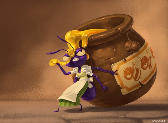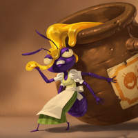 insect character, specifically a cockroach, who appears to be standing upright and is engaged in pouring liquid from a container into another one. The liquid has