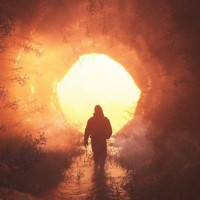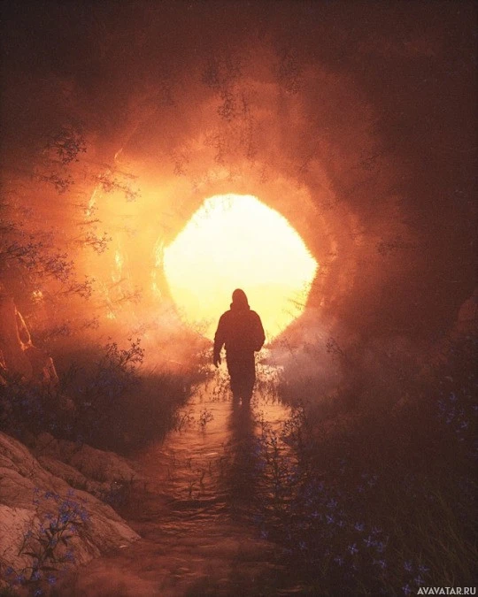 a silhouette of a person standing at the entrance of a tunnel or cave. The setting appears to be in