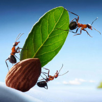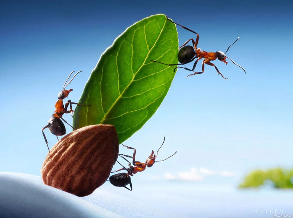 Картинка показывает группу муравьев, взаимодействующих с миндалем. Один муравей, кажется, несет орех, в то время как другой балансирует на нем. Эта сцена демонстрирует удивительную силу и координацию муравьев, когда они работают вместе в естественной обстановке.
