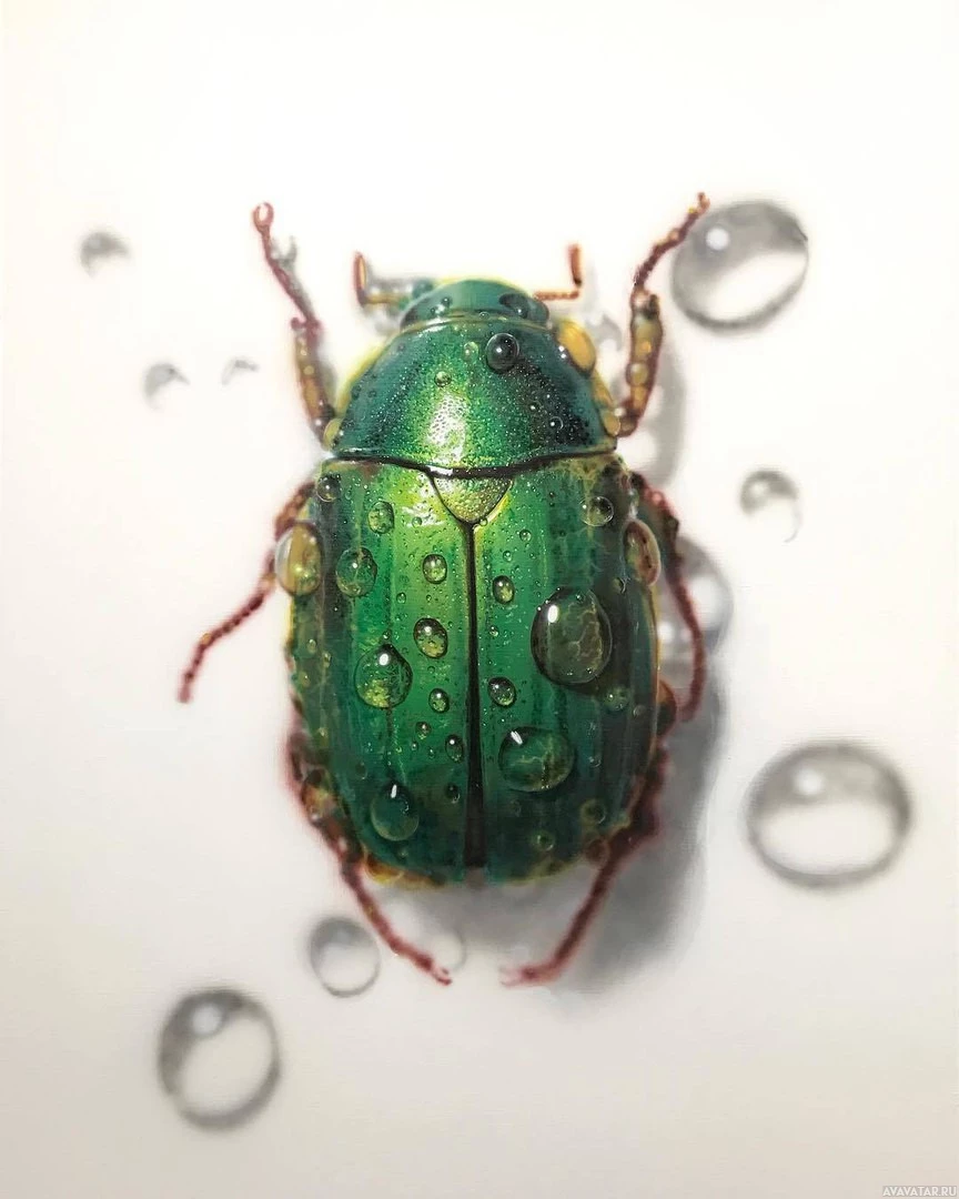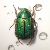 the droplets of water on its exoskeleton and the surrounding surface. The beetle has a distinctive