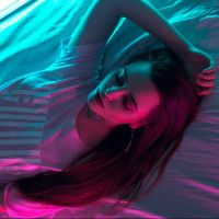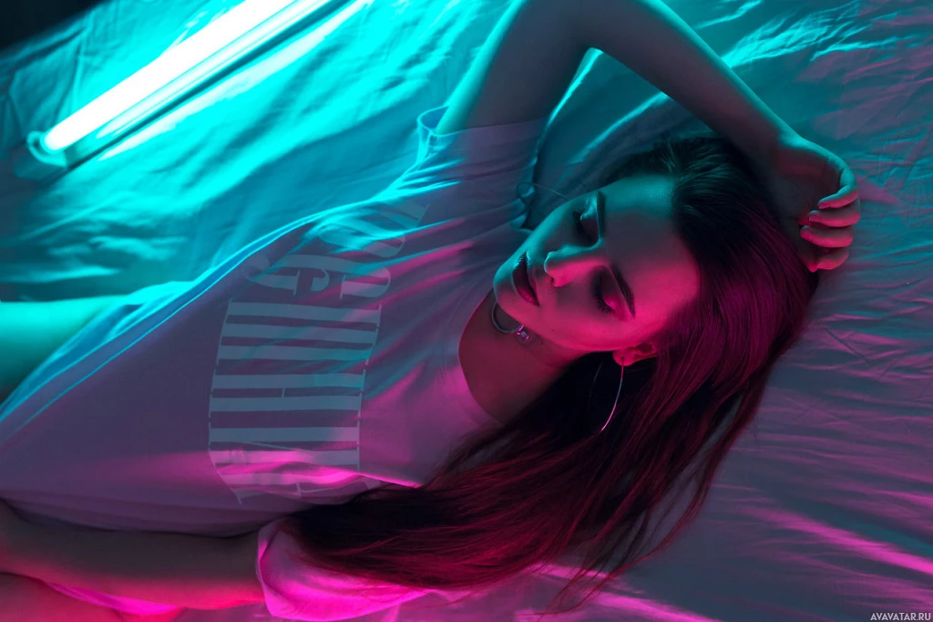 long hair and seems to be wearing a white t-shirt. The lighting in the photo is predominantly neon pink, casting