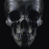 The image shows a metallic skull with intricate mechanical or robotic components integrated into its structure. It appears to be a piece of artwork, possibly representing a fusion of biology and technology.