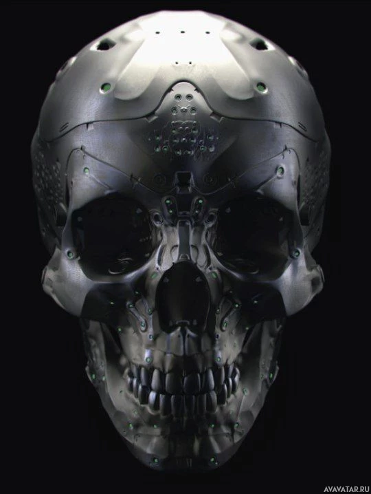 На картинке изображен металлический череп со сложными механическими или роботизированными компонентами, интегрированными в его структуру. Похоже, что это произведение искусства, возможно, представляющее собой слияние биологии и технологий.