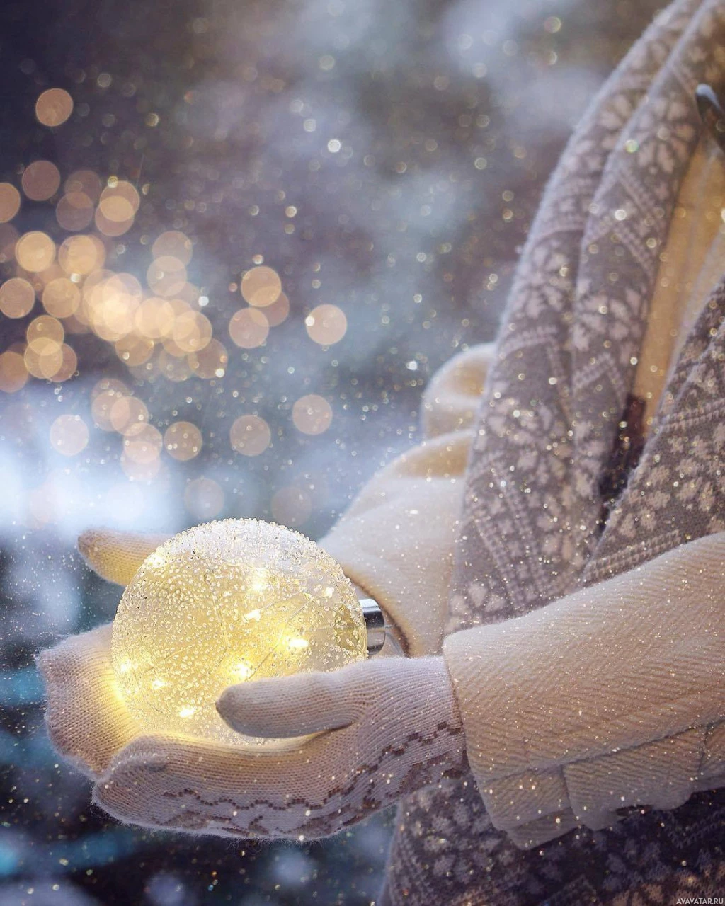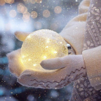 На картинке изображена рука человека, держащая украшенный рождественский орнамент. Похоже, что это снежный шар, учитывая мелкие частицы или «снег», которые находятся внутри земного шара и падают вокруг него. Фон праздничен тем, что выглядит как огни, сияющие по земному шару, создавая волшебную атмосферу. На этой фотографии не видно воздушных шаров.