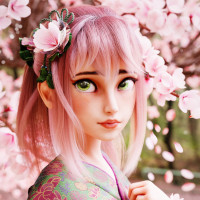 an animated character with pink hair. She is dressed in what appears to be traditional Japanese clothing, possibly a kimono or similar garment, adorned with