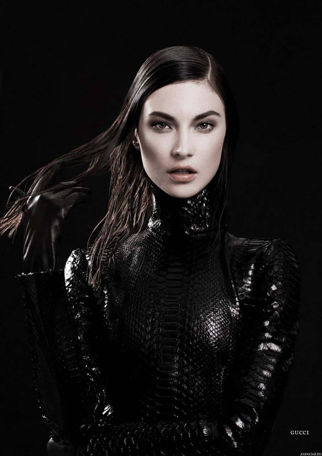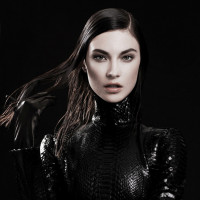 latex clothing, which gives the impression of an outfit that might be associated with a costume or fashion that emphasizes form-fitting, shiny materials. Her expression is neutral, and she has her hair pulled back from her face.