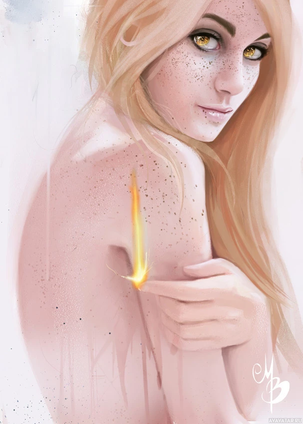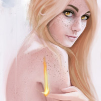 a fair complexion and is wearing minimal clothing or none at all, showcasing her upper body. Her expression is calm and introspective as she holds a flower to her nose. There are
