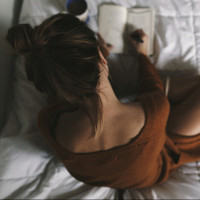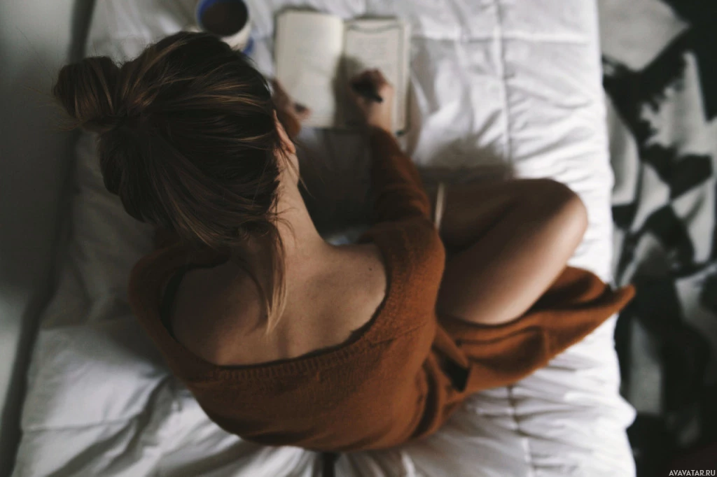 a brown sweater and appears to be reading or writing in a notebook or book that is open in front of her. Her posture suggests she might be relaxed, possibly taking some time for herself by engaging in quiet activities like journaling, reading, or studying. The setting seems to be a personal