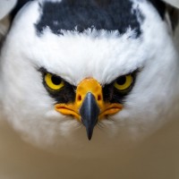 The picture shows a bird, specifically an eagle, with a detailed close-up of its head. It appears to be in a somewhat assertive or defensive posture, given the open beak and flared feathers around the head.