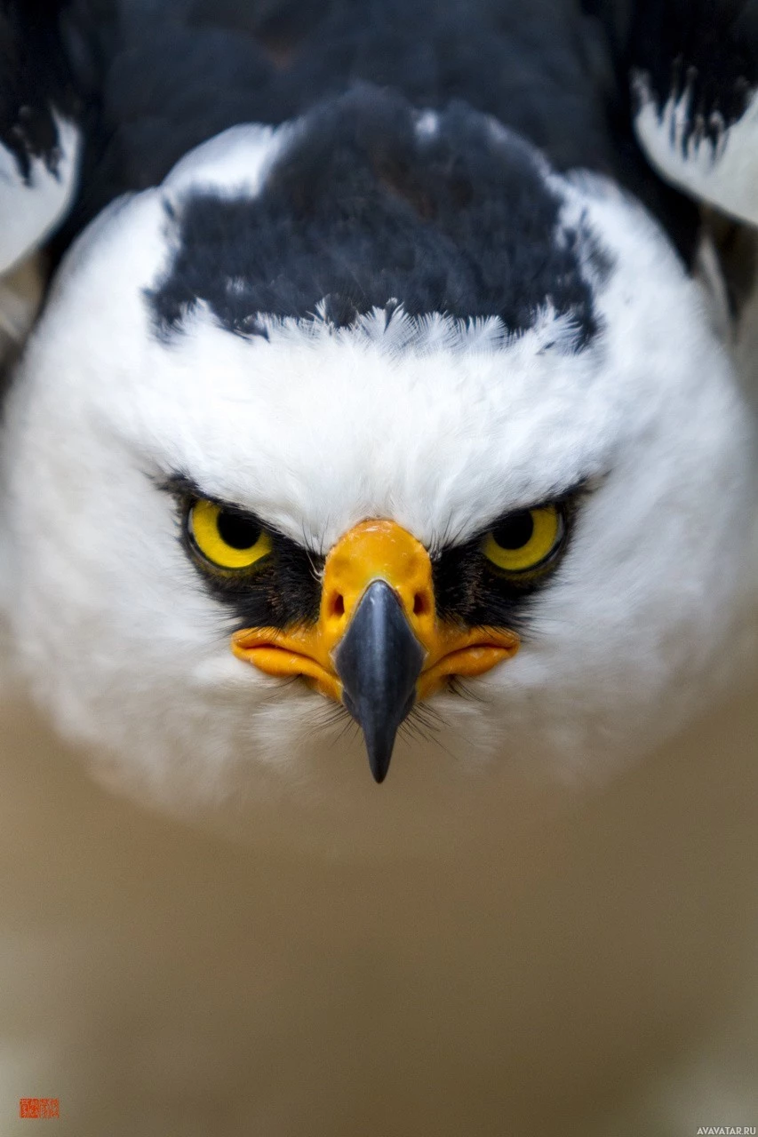 На снимке изображена птица, в частности орел, с детальным крупным планом головы. Похоже, что он находится в несколько напористой или оборонительной позе, учитывая открытый клюв и вспыхнувшие перья вокруг головы.