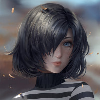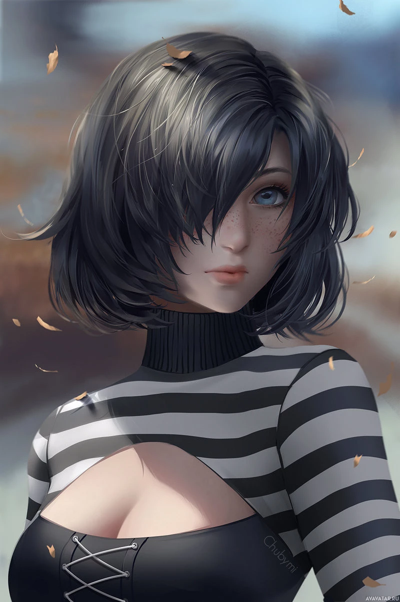 На картинке изображен анимированный персонаж с прической брюнетки, одетый в полосатую одежду. У нее на лице несколько мрачное или созерцательное выражение.